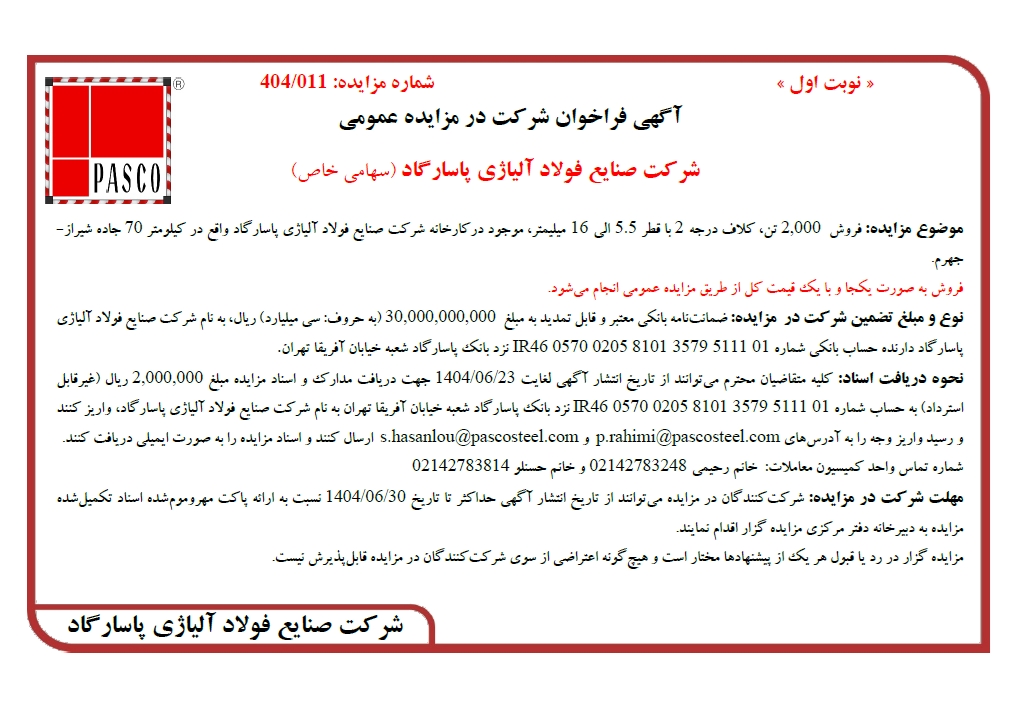 نحوه دریافت اسناد: کلیه متقاضیان محترم میتوانند از تاریخ انتشار آگهی لغایت 1404/06/23 جهت دریافت مدارک و اسناد مزایده مبلغ 2,000,000 ریال (غیرقابل استرداد) به حساب شماره IR46 0570 0205 8101 3579 5111 01 نزد بانک پاسارگاد شعبه خیابان آفریقا تهران به نام شرکت صنایع فولاد آلیاژی پاسارگاد، واریز کنند و رسید واریز وجه را به آدرسهای p.rahimi@pascosteel.com و s.hasanlou@pascosteel.com ارسال کنند و اسناد مزایده را به صورت ایمیلی دریافت کنند.