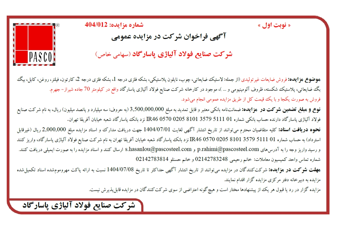 موضوع مزایده: فروش ضایعات غیرتولیدی (از جمله: لاستیک ضایعاتی، چوب، نایلون پلاستیکی، بشکه فلزی درجه 1، بشکه فلزی درجه 2، کارتون، فیلتر، روغن، کابل، بیگ بگ ضایعاتی، پلاستیک شکسته، ظروف آلومینیومی و ... )، موجود در کارخانه شرکت صنایع فولاد آلیاژی پاسارگاد واقع در کیلومتر 70 جاده شیراز- جهرم.