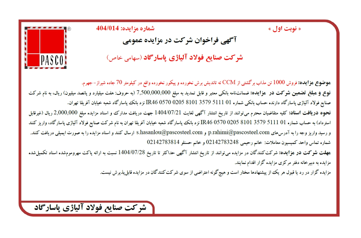 نحوه دریافت اسناد: کلیه متقاضیان محترم می‌توانند از تاریخ انتشار آگهی لغایت 1404/07/21 جهت دریافت مدارک و اسناد مزایده مبلغ 2,000,000 ریال (غیرقابل استرداد) به ‌حساب شماره IR46 0570 0205 8101 3579 5111 01 نزد بانک پاسارگاد شعبه خیابان آفریقا تهران به نام شرکت صنایع فولاد آلیاژی پاسارگاد، واریز کنند و رسید واریز وجه را به آدرس‌های p.rahimi@pascosteel.com  و s.hasanlou@pascosteel.com  ارسال کنند و اسناد مزایده را به صورت ایمیلی دریافت کنند.