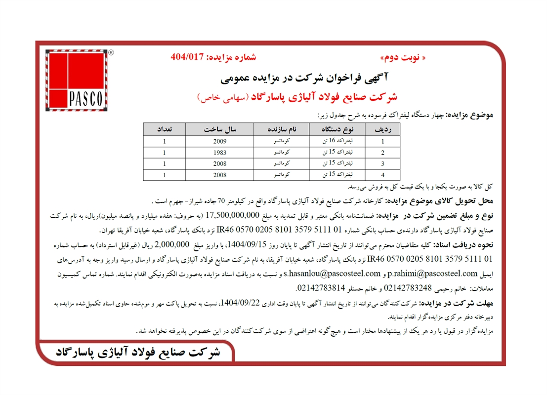 محل تحویل کالای موضوع مزایده: کارخانه شرکت صنایع فولاد آلیاژی پاسارگاد واقع در کیلومتر 70 جاده شیراز- جهرم است .