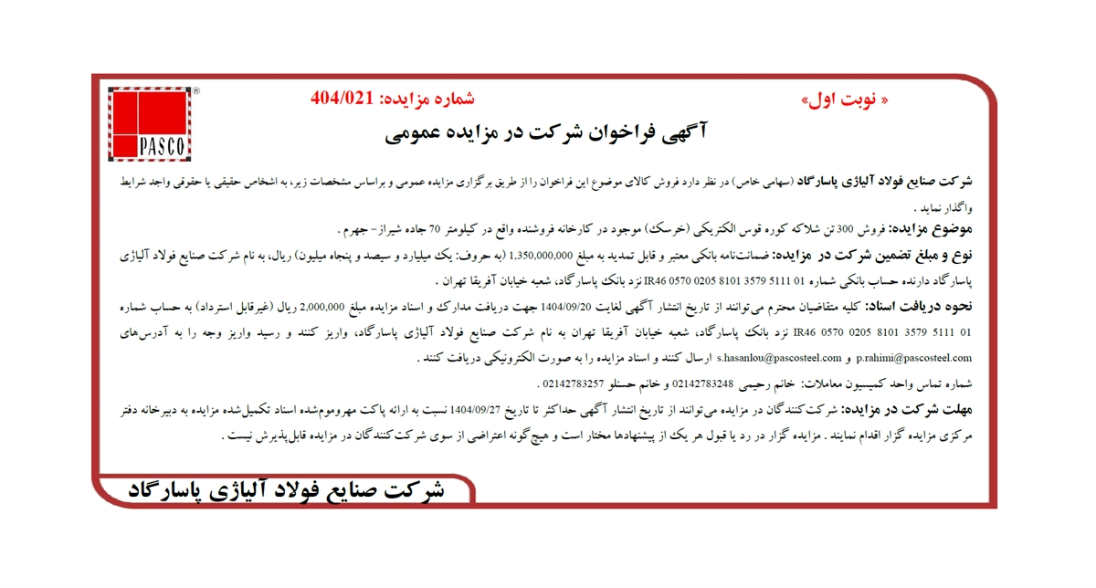 شرکت صنایع فولاد آلیاژی پاسارگاد (سهامی خاص) در نظر دارد فروش کالای موضوع این فراخوان را از طریق برگزاری مزایده عمومی و براساس مشخصات زیر، به اشخاص حقیقی یا حقوقی واجد شرایط واگذار نماید .