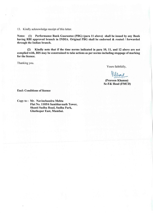 گواهینامهBIS بیانگر توانایی سازمان در طراحی، تولید و کنترل کیفیت محصول مطابق با استانداردهای کشور هند میباشد. این گواهی نشان دهنده آن است که محصول مورد نظر، کلیه استانداردهای مربوطه را دارا میباشد. دولت هندوستان اخذ این گواهی را برای بسیاری از محصولات مهم و اساسی از جمله محصولات فولادی اجباری نموده است. در واقع این گواهینامه پیش نیاز صادرات محصول به کشور هند است و این استاندارد به مصرف کنندگان اطمینان میدهد که ایمنی و کیفیت محصول توسط شخص ثالث مورد ارزیابی قرار گرفته است.