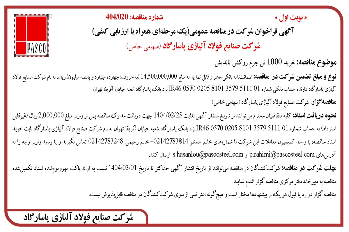 نحوه دریافت اسناد: کلیه متقاضیان محترم می‌توانند از تاریخ انتشار آگهی لغایت 1404/02/25 جهت دریافت مدارک مناقصه پس از واریز مبلغ 2,000,000 ریال (غیرقابل استرداد) به ‌حساب شماره IR46 0570 0205 8101 3579 5111 01 نزد بانک پاسارگاد شعبه خیابان آفریقا تهران به نام شرکت صنایع فولاد آلیاژی پاسارگاد بابت خرید اسناد مناقصه، با واحد کمیسیون معاملات این شرکت با شماره‌های خانم حسنلو 02142783814– خانم رحیمی 02142783248 تماس بگیرند و یا رسید واریز وجه را به آدرس‌های p.rahimi@pascosteel.com  و s.hasanlou@pascosteel.com  ارسال کنند.