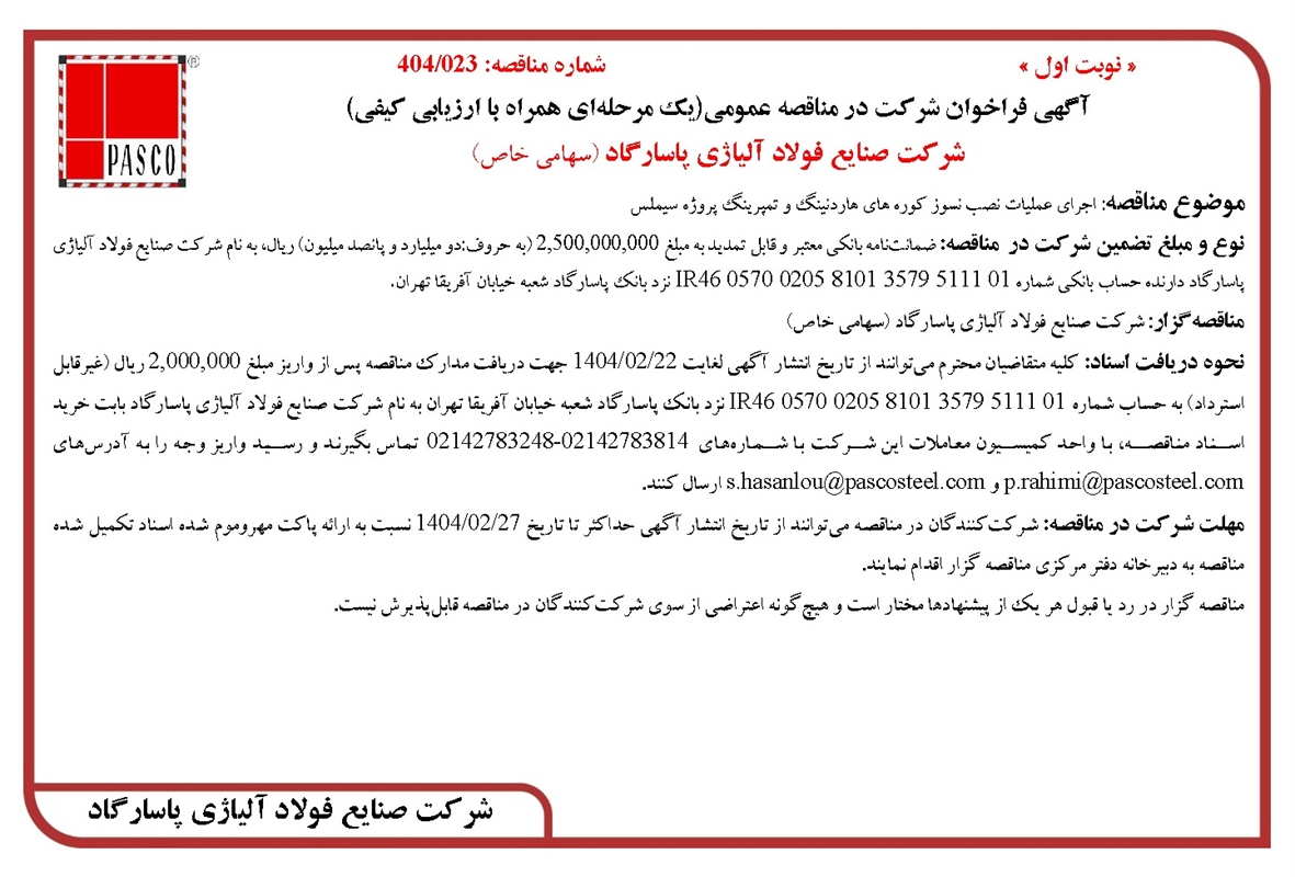 نحوه دریافت اسناد: کلیه متقاضیان محترم می‌توانند از تاریخ انتشار آگهی لغایت 1404/02/22 جهت دریافت مدارک مناقصه پس از واریز مبلغ 2,000,000 ریال (غیرقابل استرداد) به ‌حساب شماره IR46 0570 0205 8101 3579 5111 01 نزد بانک پاسارگاد شعبه خیابان آفریقا تهران به نام شرکت صنایع فولاد آلیاژی پاسارگاد بابت خرید اسناد مناقصه، با واحد کمیسیون معاملات این شرکت با شماره‌های02142783814 - 02142783248تماس بگیرند و رسید واریز وجه را به آدرس‌های p.rahimi@pascosteel.com و s.hasanlou@pascosteel.com ارسال کنند.