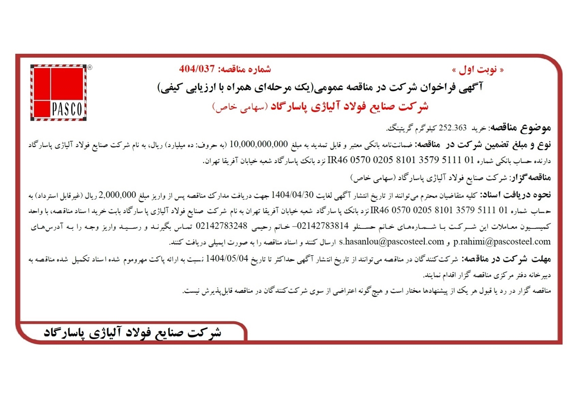نحوه دریافت اسناد: کلیه متقاضیان محترم می‌توانند از تاریخ انتشار آگهی لغایت 1404/04/30 جهت دریافت مدارک مناقصه پس از واریز مبلغ 2,000,000 ریال (غیرقابل استرداد) به ‌حساب شماره IR46 0570 0205 8101 3579 5111 01 نزد بانک پاسارگاد شعبه خیابان آفریقا تهران به نام شرکت صنایع فولاد آلیاژی پاسارگاد بابت خرید اسناد مناقصه، با واحد کمیسیون معاملات این شرکت با شماره‌های خانم حسنلو 02142783814 – خانم رحیمی  02142783248 تماس بگیرند و رسید واریز وجه را به آدرس‌های p.rahimi@pascosteel.com  و s.hasanlou@pascosteel.com  ارسال کنند و اسناد مناقصه را به صورت ایمیلی دریافت کنند.