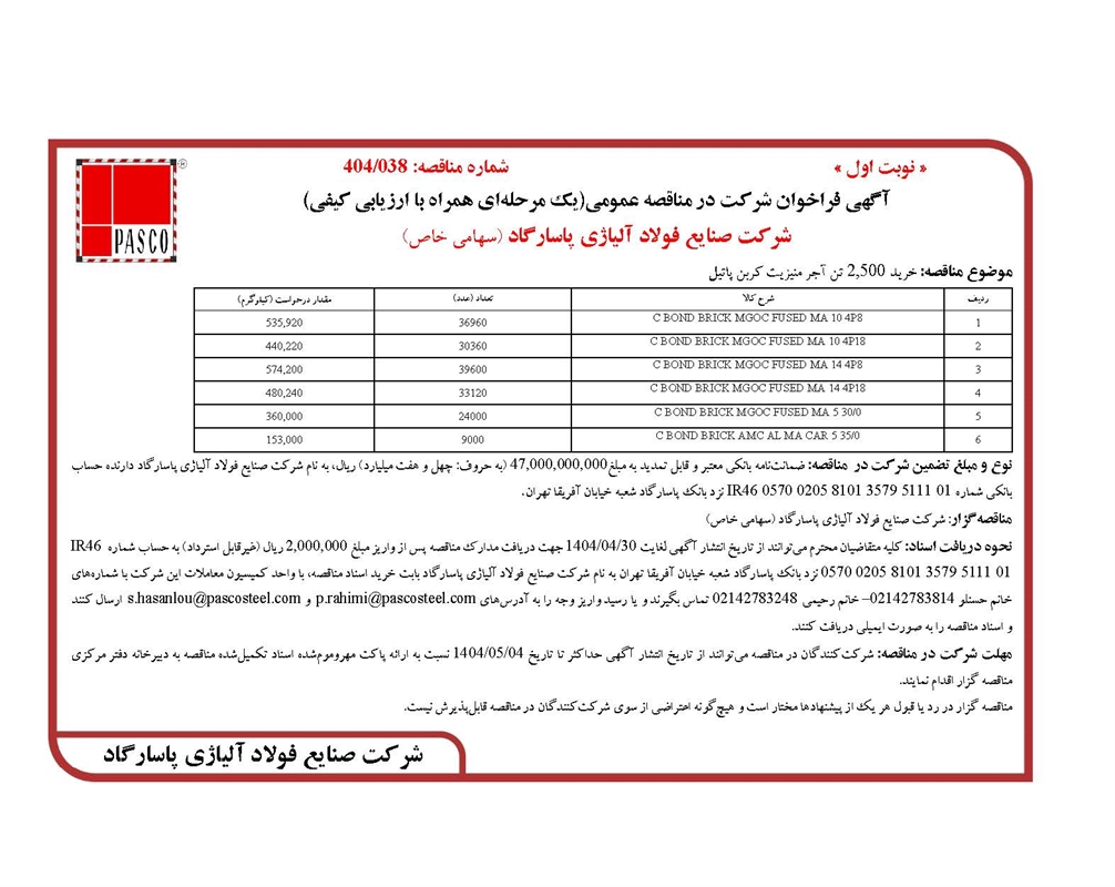 نحوه دریافت اسناد: کلیه متقاضیان محترم می‌توانند از تاریخ انتشار آگهی لغایت 1404/04/30 جهت دریافت مدارک مناقصه پس از واریز مبلغ 2,000,000 ریال (غیرقابل استرداد) به ‌حساب شماره IR46 0570 0205 8101 3579 5111 01 نزد بانک پاسارگاد شعبه خیابان آفریقا تهران به نام شرکت صنایع فولاد آلیاژی پاسارگاد بابت خرید اسناد مناقصه، با واحد کمیسیون معاملات این شرکت با شماره‌های خانم حسنلو 02142783814 – خانم رحیمی 02142783248 تماس بگیرند و یا رسید واریز وجه را به آدرس‌های p.rahimi@pascosteel.com  و s.hasanlou@pascosteel.com ارسال کنند و اسناد مناقصه را به صورت ایمیلی دریافت کنند.