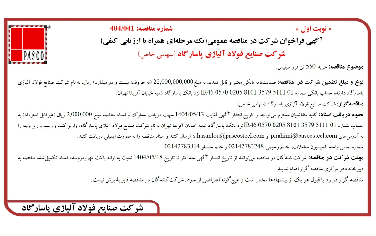 مناقصهگزار: شرکت صنایع فولاد آلیاژی پاسارگاد (سهامی خاص)
