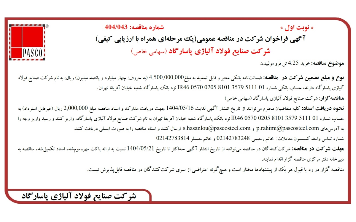 نحوه دریافت اسناد: کلیه متقاضیان محترم میتوانند از تاریخ انتشار آگهی لغایت 1404/05/16 جهت دریافت مدارک و اسناد مناقصه مبلغ 2,000,000 ریال (غیرقابل استرداد) به حساب شماره IR46 0570 0205 8101 3579 5111 01 نزد بانک پاسارگاد شعبه خیابان آفریقا تهران به نام شرکت صنایع فولاد آلیاژی پاسارگاد، واریز کنند و رسید واریز وجه را به آدرسهای p.rahimi@pascosteel.com و s.hasanlou@pascosteel.com ارسال کنند و اسناد مناقصه را به صورت ایمیلی دریافت کنند.