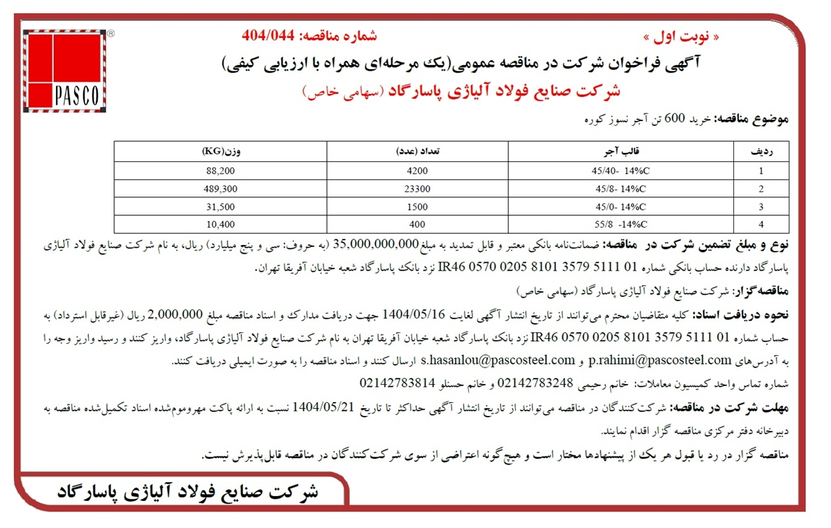 نحوه دریافت اسناد: کلیه متقاضیان محترم میتوانند از تاریخ انتشار آگهی لغایت 1404/05/16 جهت دریافت مدارک و اسناد مناقصه مبلغ 2,000,000 ریال (غیرقابل استرداد) به حساب شماره IR46 0570 0205 8101 3579 5111 01 نزد بانک پاسارگاد شعبه خیابان آفریقا تهران به نام شرکت صنایع فولاد آلیاژی پاسارگاد، واریز کنند و رسید واریز وجه را به آدرسهای p.rahimi@pascosteel.com و s.hasanlou@pascosteel.com ارسال کنند و اسناد مناقصه را به صورت ایمیلی دریافت کنند.