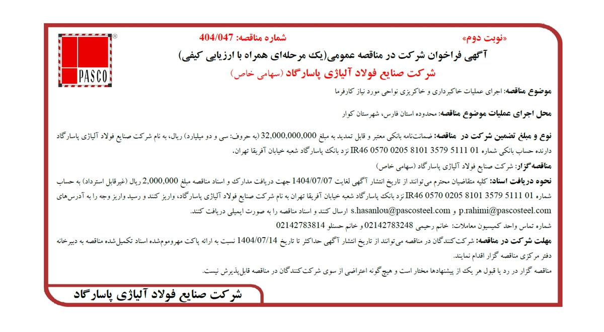نحوه دریافت اسناد: کلیه متقاضیان محترم میتوانند از تاریخ انتشار آگهی لغایت 1404/07/07 جهت دریافت مدارک و اسناد مناقصه مبلغ 2,000,000 ریال (غیرقابل استرداد) به حساب شماره IR46 0570 0205 8101 3579 5111 01 نزد بانک پاسارگاد شعبه خیابان آفریقا تهران به نام شرکت صنایع فولاد آلیاژی پاسارگاد، واریز کنند و رسید واریز وجه را به آدرسهای p.rahimi@pascosteel.com و s.hasanlou@pascosteel.com ارسال کنند و اسناد مناقصه را به صورت ایمیلی دریافت کنند.