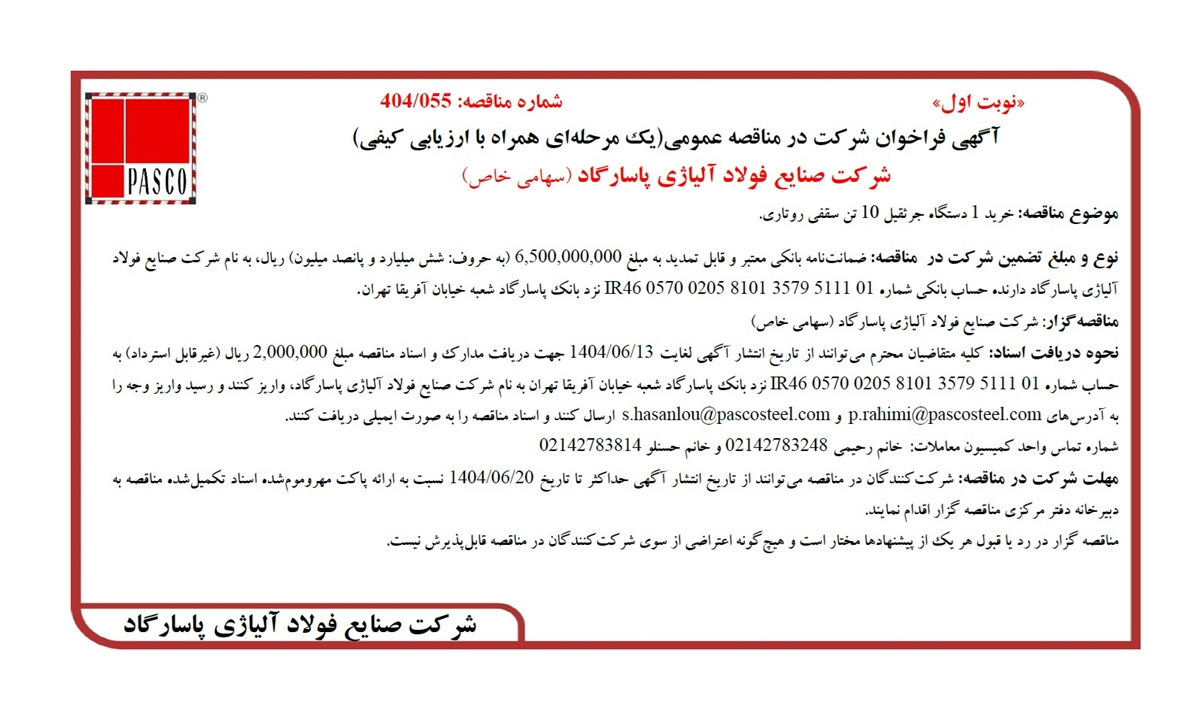نحوه دریافت اسناد: کلیه متقاضیان محترم میتوانند از تاریخ انتشار آگهی لغایت 1404/06/13 جهت دریافت مدارک و اسناد مناقصه مبلغ 2,000,000 ریال (غیرقابل استرداد) به حساب شماره IR46 0570 0205 8101 3579 5111 01 نزد بانک پاسارگاد شعبه خیابان آفریقا تهران به نام شرکت صنایع فولاد آلیاژی پاسارگاد، واریز کنند و رسید واریز وجه را به آدرسهای p.rahimi@pascosteel.com و s.hasanlou@pascosteel.com ارسال کنند و اسناد مناقصه را به صورت ایمیلی دریافت کنند.