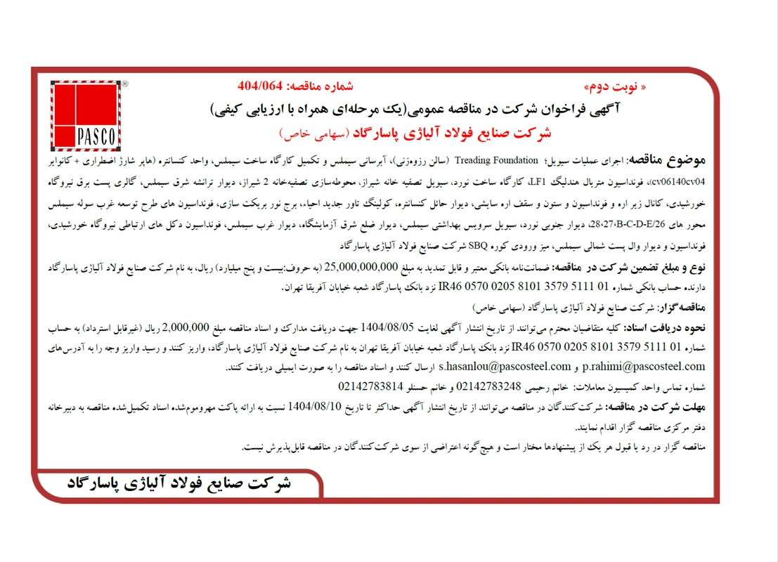 موضوع مناقصه: اجرای عملیات سیویل؛ Treading Foundation (سالن رزوهزنی)، آبرسانی سیملس و تکمیل کارگاه ساخت سیملس، واحد کنسانتره (هاپر شارژ اضطراری + کانوایر cv06140cv04)، فونداسیون متریال هندلیگ LF1، کارگاه ساخت نورد، سیویل تصفیه خانه شیراز، محوطهسازی تصفیهخانه 2 شیراز، دیوار ترانشه شرق سیملس، گالری پست برق نیروگاه خورشیدی، کانال زیر اره و فونداسیون و ستون و سقف اره سایشی، دیوار حائل کنسانتره، کولینگ تاور جدید احیاء، برج نور بریکت سازی، فونداسیون های طرح توسعه غرب سوله سیملس محور های B-C-D-E/26،27،28، دیوار جنوبی نورد، سیویل سرویس بهداشتی سیملس، دیوار ضلع شرق آزمایشگاه، دیوار غرب سیملس، فونداسیون دکل های ارتباطی نیروگاه خورشیدی، فونداسیون و دیوار وال پست شمالی سیملس، میز ورودی کوره SBQ شرکت صنایع فولاد آلیاژی پاسارگاد