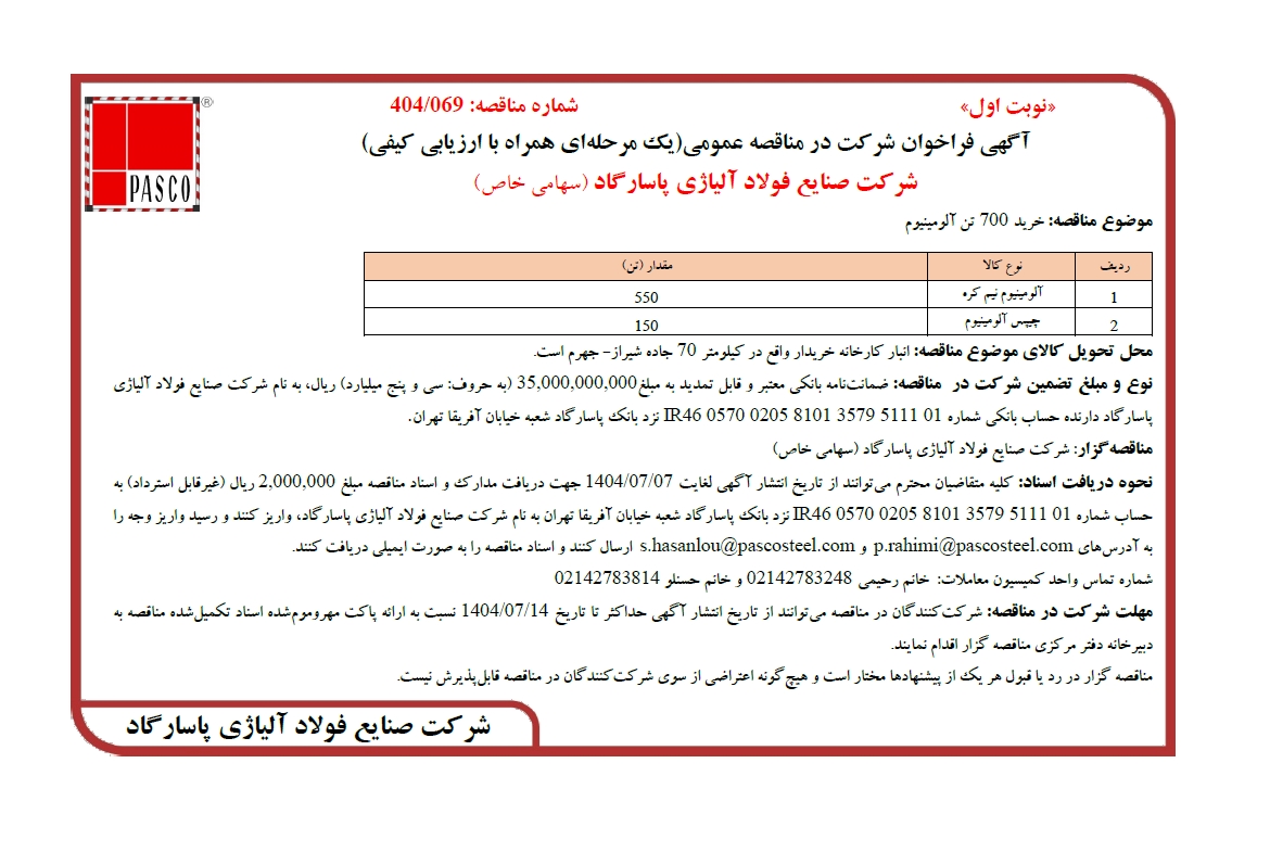 موضوع مناقصه: خرید 700 تن آلومینیوم