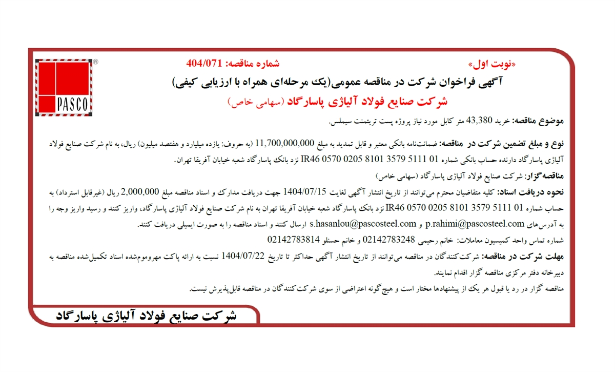 نحوه دریافت اسناد: کلیه متقاضیان محترم میتوانند از تاریخ انتشار آگهی لغایت 1404/07/15 جهت دریافت مدارک و اسناد مناقصه مبلغ 2,000,000 ریال (غیرقابل استرداد) به حساب شماره IR46 0570 0205 8101 3579 5111 01 نزد بانک پاسارگاد شعبه خیابان آفریقا تهران به نام شرکت صنایع فولاد آلیاژی پاسارگاد، واریز کنند و رسید واریز وجه را به آدرسهای p.rahimi@pascosteel.com و s.hasanlou@pascosteel.com ارسال کنند و اسناد مناقصه را به صورت ایمیلی دریافت کنند.