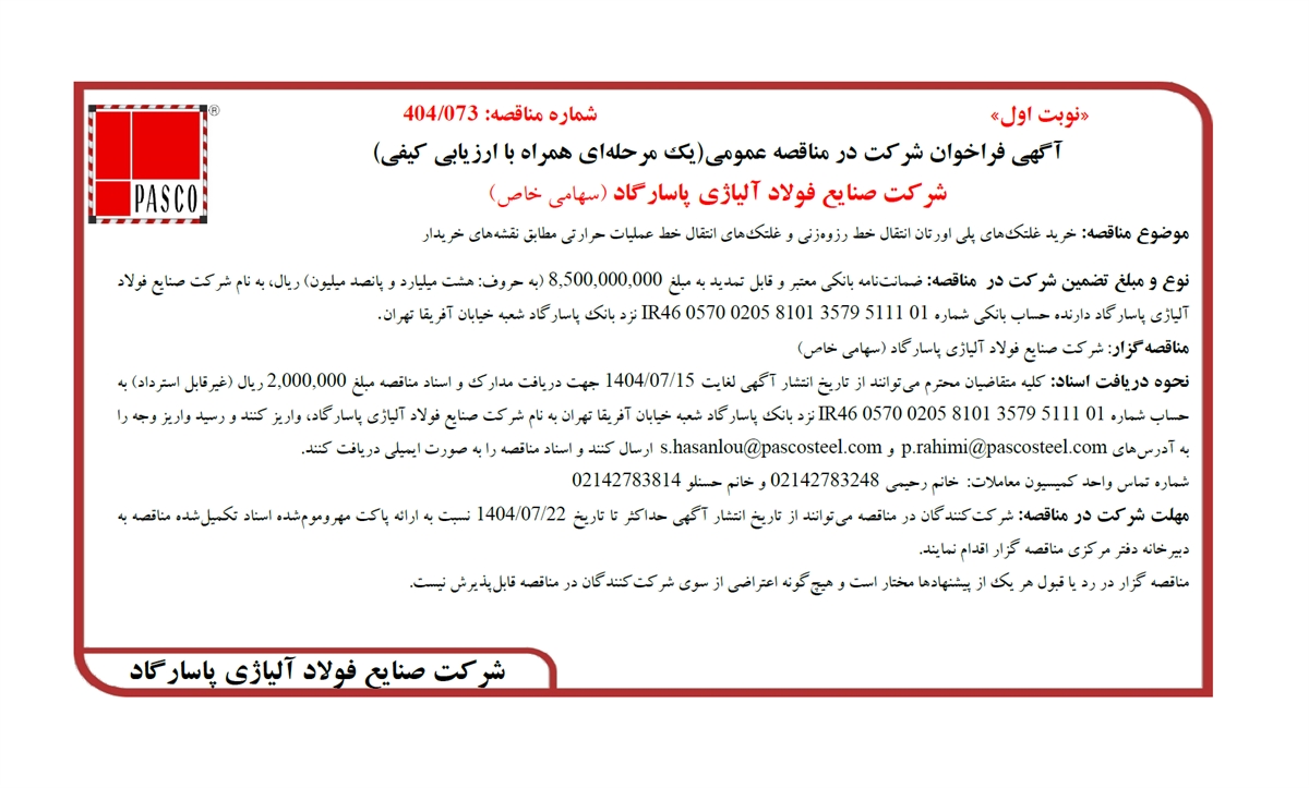 نحوه دریافت اسناد: کلیه متقاضیان محترم میتوانند از تاریخ انتشار آگهی لغایت 1404/07/15 جهت دریافت مدارک و اسناد مناقصه مبلغ 2,000,000 ریال (غیرقابل استرداد) به حساب شماره IR46 0570 0205 8101 3579 5111 01 نزد بانک پاسارگاد شعبه خیابان آفریقا تهران به نام شرکت صنایع فولاد آلیاژی پاسارگاد، واریز کنند و رسید واریز وجه را به آدرسهای p.rahimi@pascosteel.com و s.hasanlou@pascosteel.com ارسال کنند و اسناد مناقصه را به صورت ایمیلی دریافت کنند.