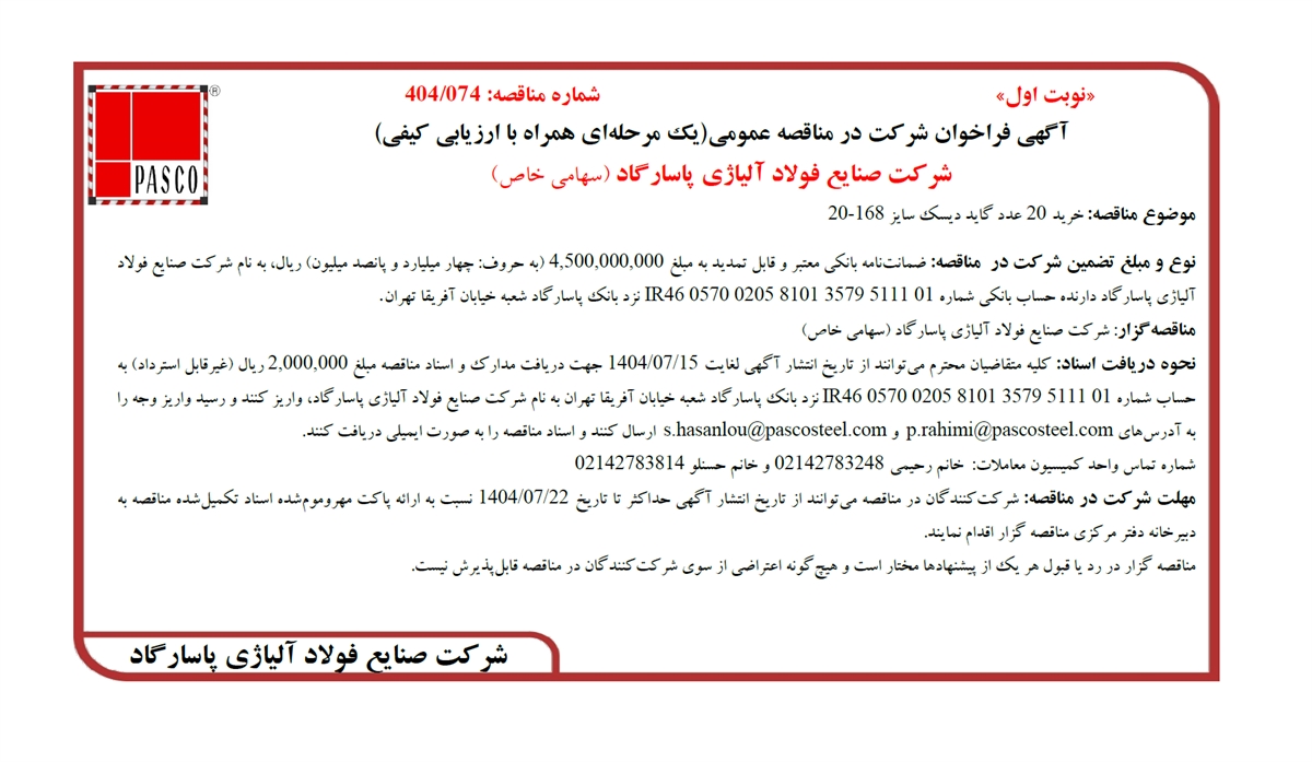 نحوه دریافت اسناد: کلیه متقاضیان محترم میتوانند از تاریخ انتشار آگهی لغایت 1404/07/15 جهت دریافت مدارک و اسناد مناقصه مبلغ 2,000,000 ریال (غیرقابل استرداد) به حساب شماره IR46 0570 0205 8101 3579 5111 01 نزد بانک پاسارگاد شعبه خیابان آفریقا تهران به نام شرکت صنایع فولاد آلیاژی پاسارگاد، واریز کنند و رسید واریز وجه را به آدرسهای p.rahimi@pascosteel.com و s.hasanlou@pascosteel.com ارسال کنند و اسناد مناقصه را به صورت ایمیلی دریافت کنند.