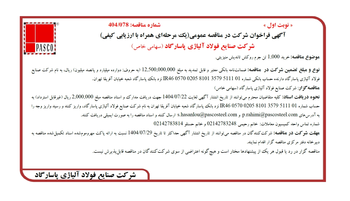نحوه دریافت اسناد: کلیه متقاضیان محترم میتوانند از تاریخ انتشار آگهی لغایت 1404/07/22 جهت دریافت مدارک و اسناد مناقصه مبلغ 2,000,000 ریال (غیرقابل استرداد) به حساب شماره IR46 0570 0205 8101 3579 5111 01 نزد بانک پاسارگاد شعبه خیابان آفریقا تهران به نام شرکت صنایع فولاد آلیاژی پاسارگاد، واریز کنند و رسید واریز وجه را به آدرسهای p.rahimi@pascosteel.com و s.hasanlou@pascosteel.com ارسال کنند و اسناد مناقصه را به صورت ایمیلی دریافت کنند.