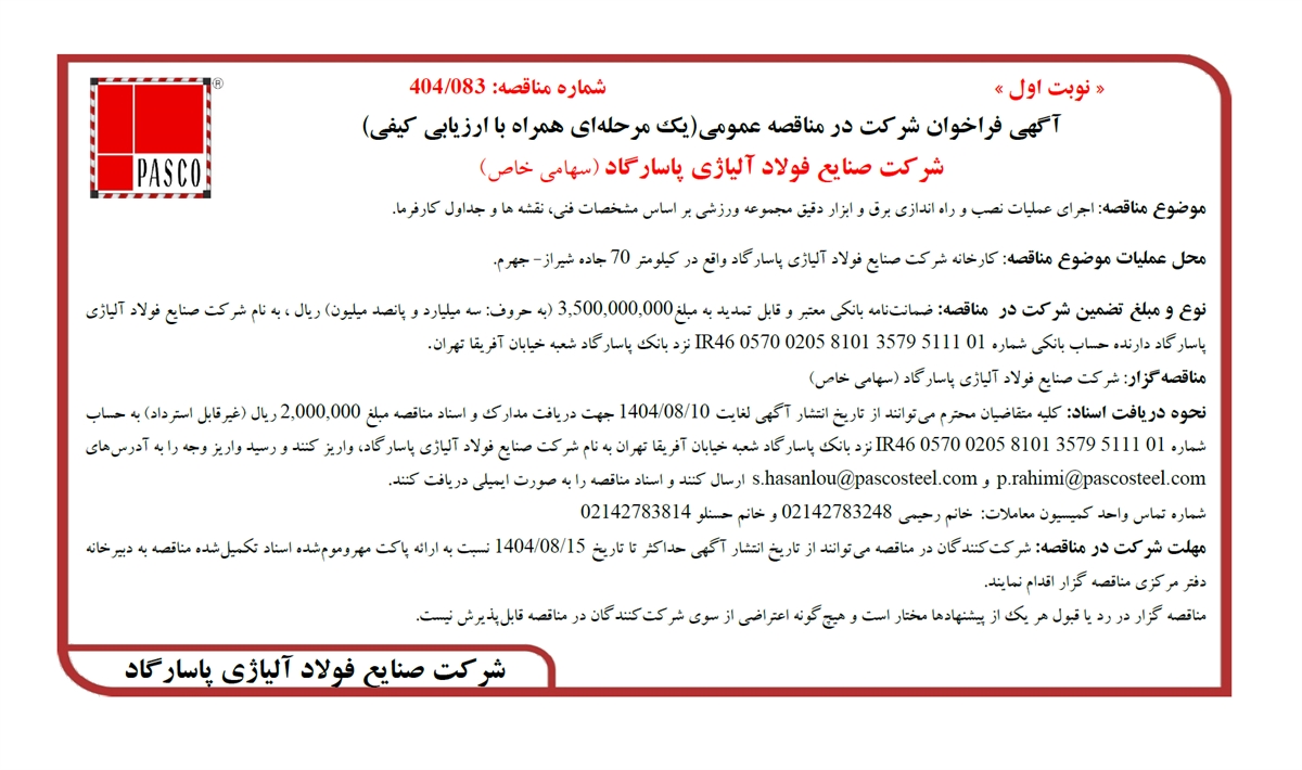 نحوه دریافت اسناد: کلیه متقاضیان محترم میتوانند از تاریخ انتشار آگهی لغایت 1404/08/10 جهت دریافت مدارک و اسناد مناقصه مبلغ 2,000,000 ریال (غیرقابل استرداد) به حساب شماره IR46 0570 0205 8101 3579 5111 01 نزد بانک پاسارگاد شعبه خیابان آفریقا تهران به نام شرکت صنایع فولاد آلیاژی پاسارگاد، واریز کنند و رسید واریز وجه را به آدرسهای p.rahimi@pascosteel.com و s.hasanlou@pascosteel.com ارسال کنند و اسناد مناقصه را به صورت ایمیلی دریافت کنند.