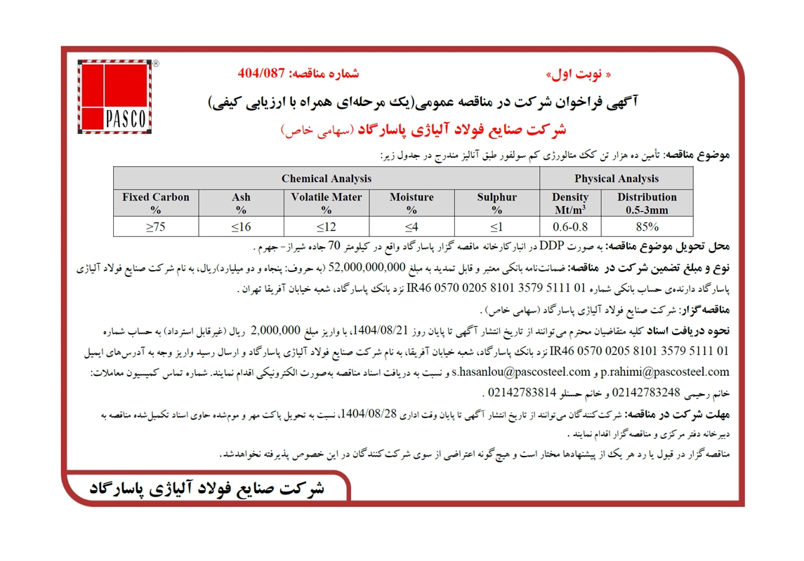 IR46 0570 0205 8101 3579 5111 01 نزد بانک پاسارگاد، شعبه خیابان آفریقا، به نام شرکت صنایع فولاد آلیاژی پاسارگاد و ارسال رسید واریز وجه به آدرسهای ایمیل p.rahimi@pascosteel.com و s.hasanlou@pascosteel.com و نسبت به دریافت اسناد مناقصه بهصورت الکترونیکی اقدام نمایند. شماره تماس کمیسیون معاملات: خانم رحیمی 02142783248 و خانم حسنلو 02142783814 .