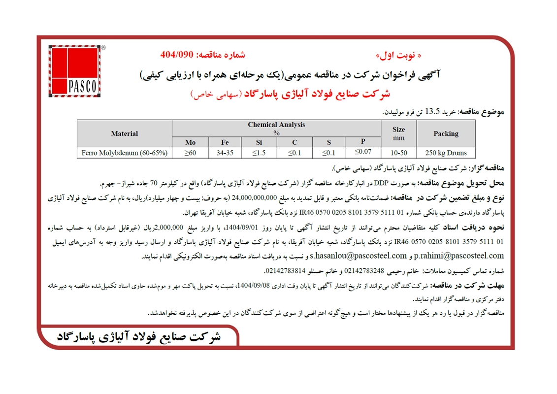 موضوع مناقصه: خرید 13.5 تن فرومولیبدن.