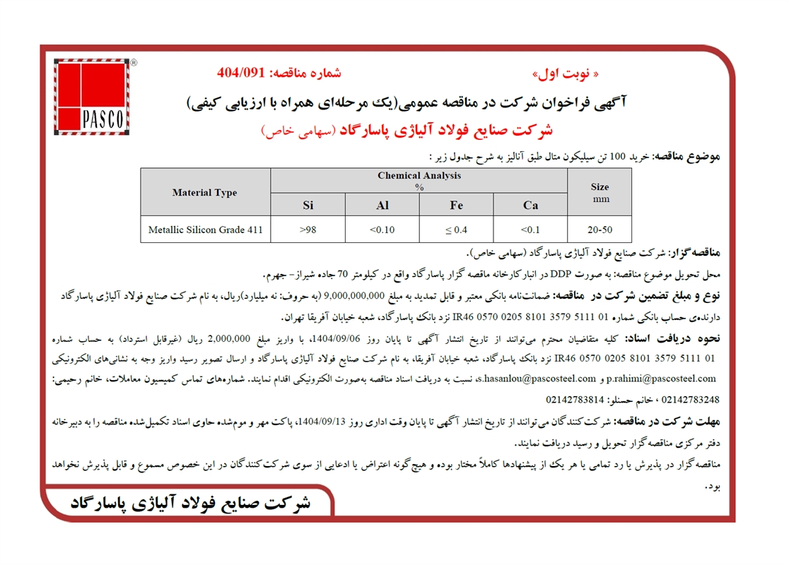 مناقصهگزار: شرکت صنایع فولاد آلیاژی پاسارگاد (سهامی خاص).