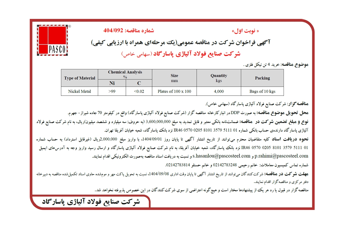 موضوع مناقصه: خرید 4 تن نیکل فلزی .